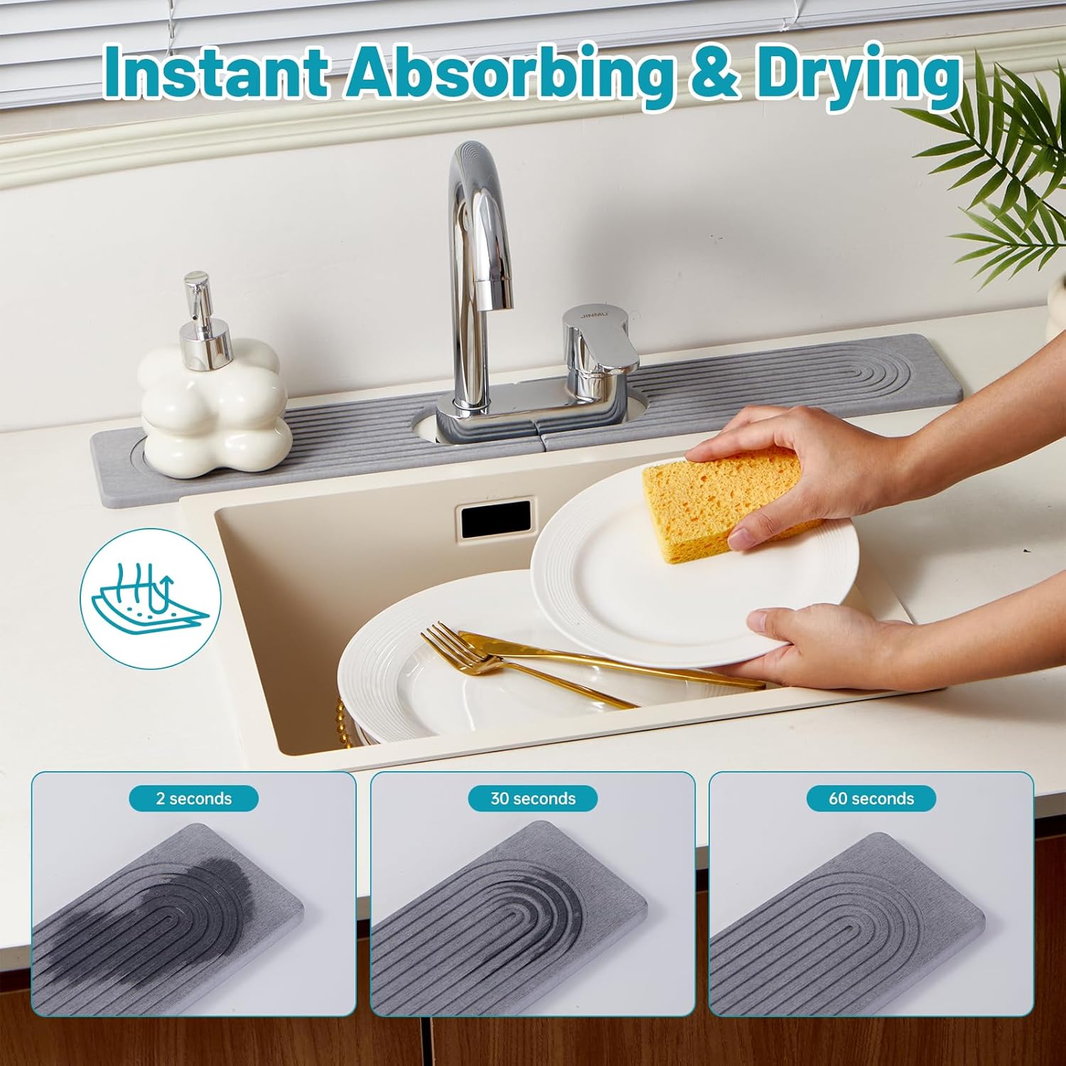 - Super Absorbent: This diatomaceous earth faucet mat absorbs water instantly, keeping your kitchen or bathroom countertop dry and clean. No more water stains or puddles around your sink.promoting a hygienic environment.