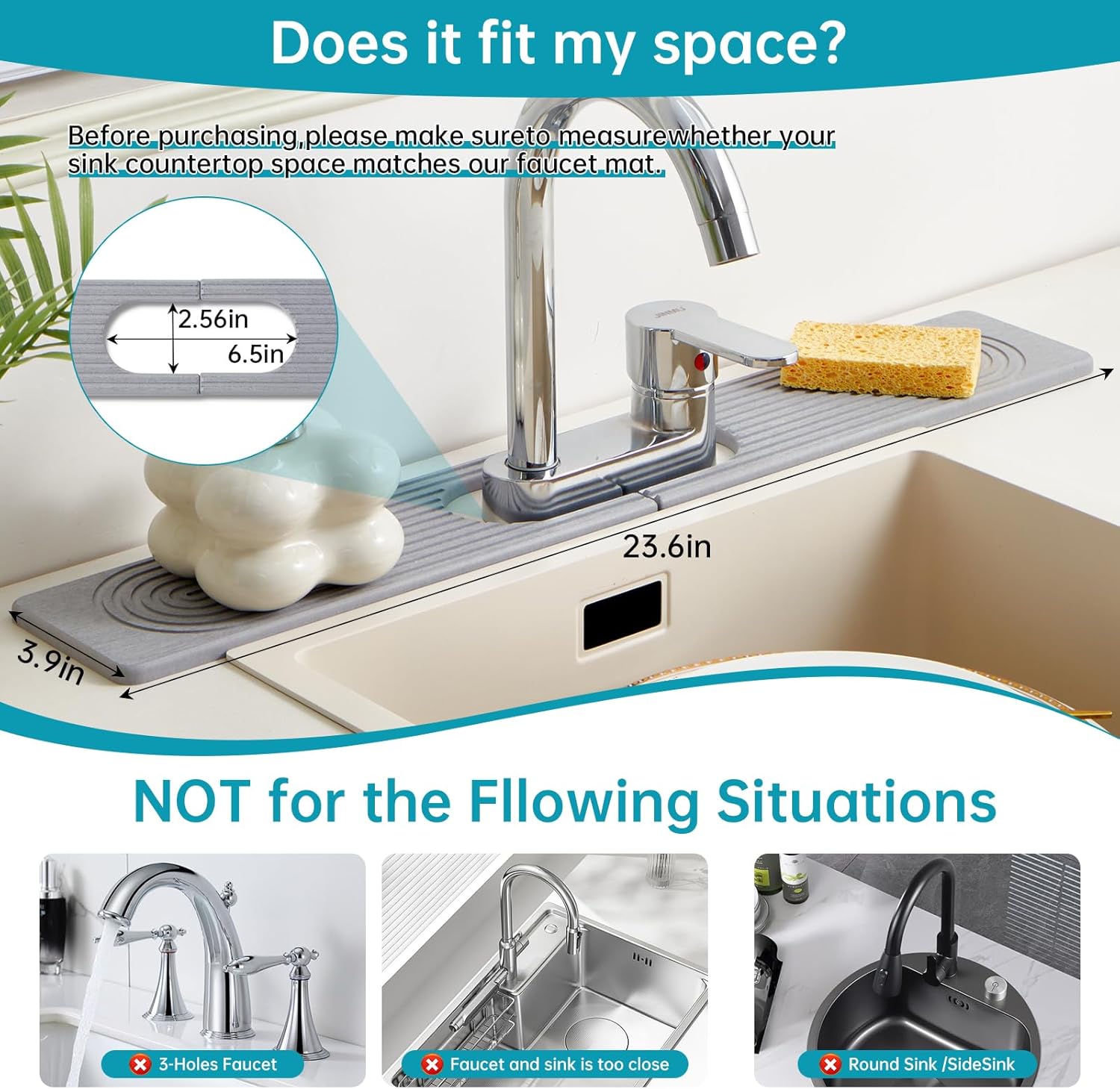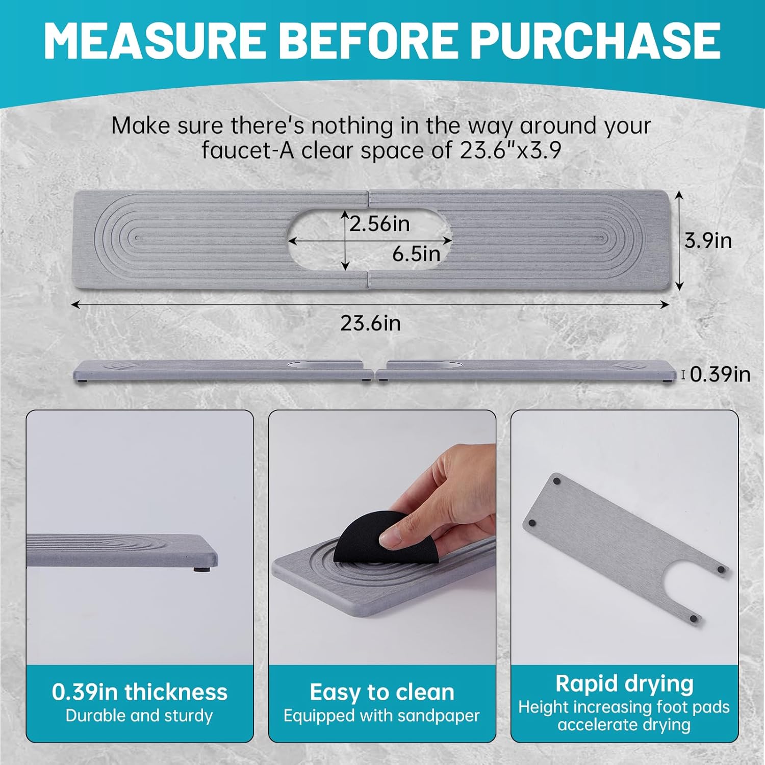- Please Measure Before Purchasing – This mat measures 23.6" × 3.9" × 0.35" with an oval hole about 6.5" × 2.5". Make sure it fits your faucet base and does not cover any sink buttons or soap dispensers. If your faucet area is smaller than these dimensions, this mat may not be suitable.