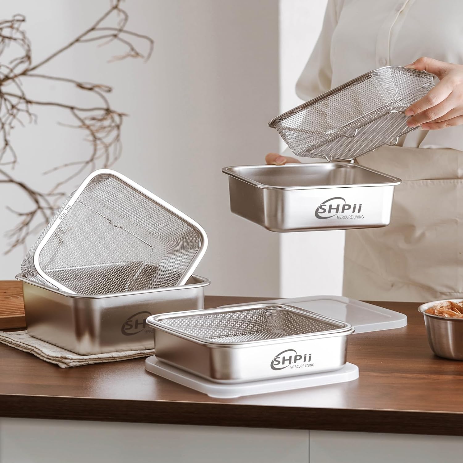 Square Colander Set, 304 Stainless Steel with PE Lid, Storage Container, Tofu Drainer, Back of House Preparation, Washing and Drainage Tools, Refrigerator Storage, Picnic Party (2000ML)