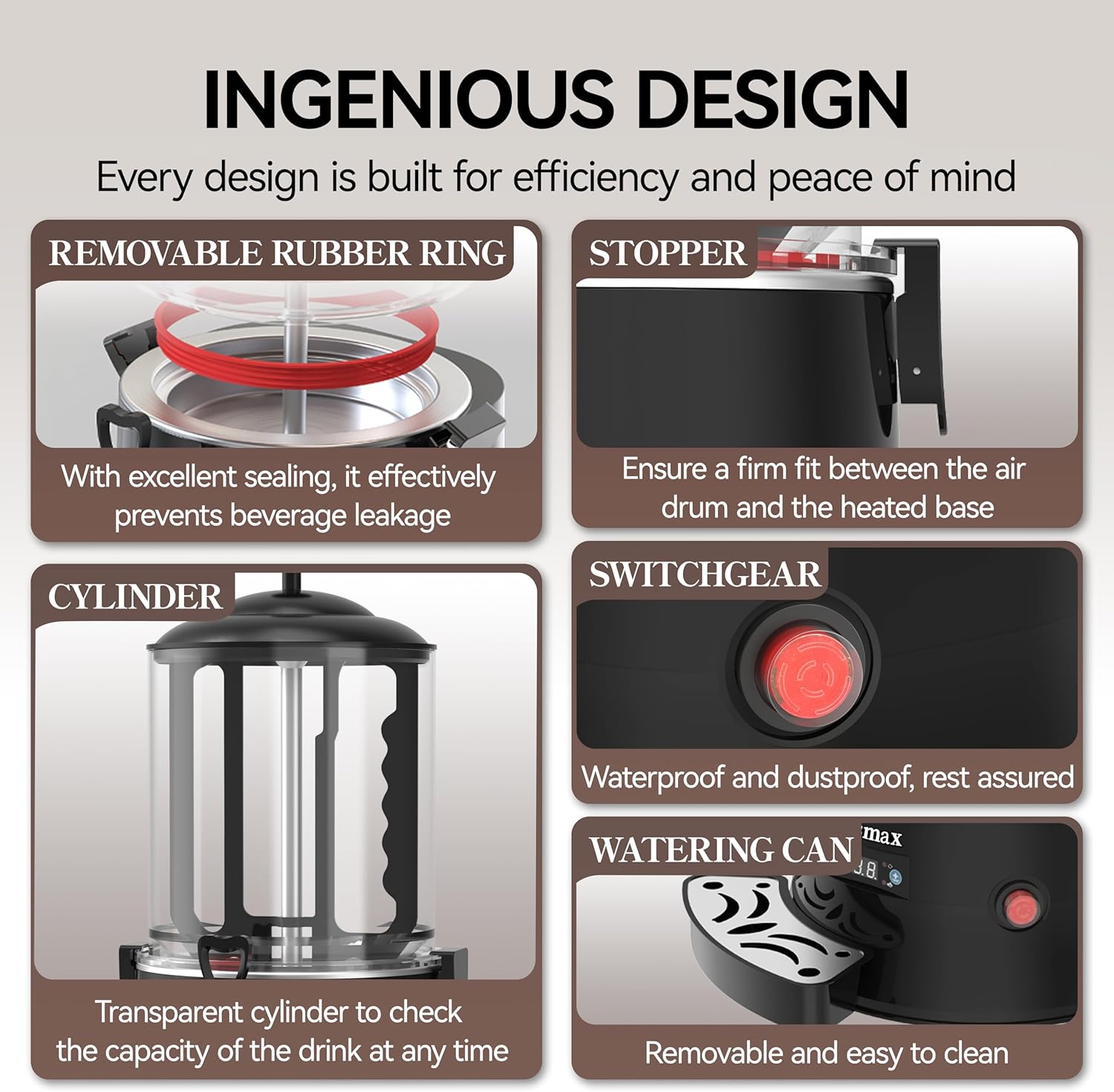 - 【Multi-purpose machine】 Specialized in chocolate drinks, spiral mixing with constant temperature anti-scorching. Accurately adapted to dark chocolate and cocoa butter, delicate drink, goodbye to the trouble of lumps. Multi-functional hot beverage dispenser, support chocolate, milk, milk tea and so on, easy to improve work efficiency. Suitable for families, hotels, restaurants, cafes and other commercial scenarios