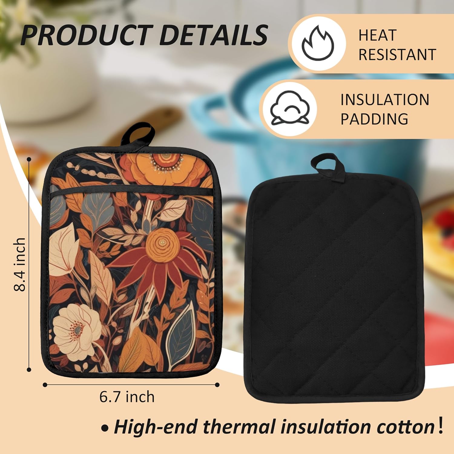Boho Vintage Floral Pot Holders for Kitchen, Mid Century Modern Boho Flower Botanical Heat Resistant Hot Pads and Oven Mitts for Baking Cooking
