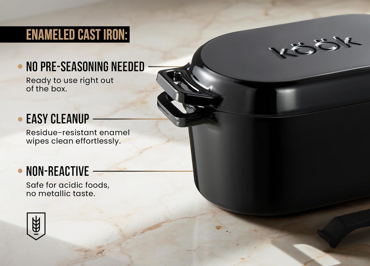 Kook Dutch Oven with Lid, Sourdough Bread Baking Supplies, Banneton Bread Proofing Set, Dual Handles, Enameled Cast Iron, Great for Baking Bread, 3.4 Qt, Artisan Sourdough Bread Making Kit, 9.8 Inch Rattan Baskets and Liners, Oval