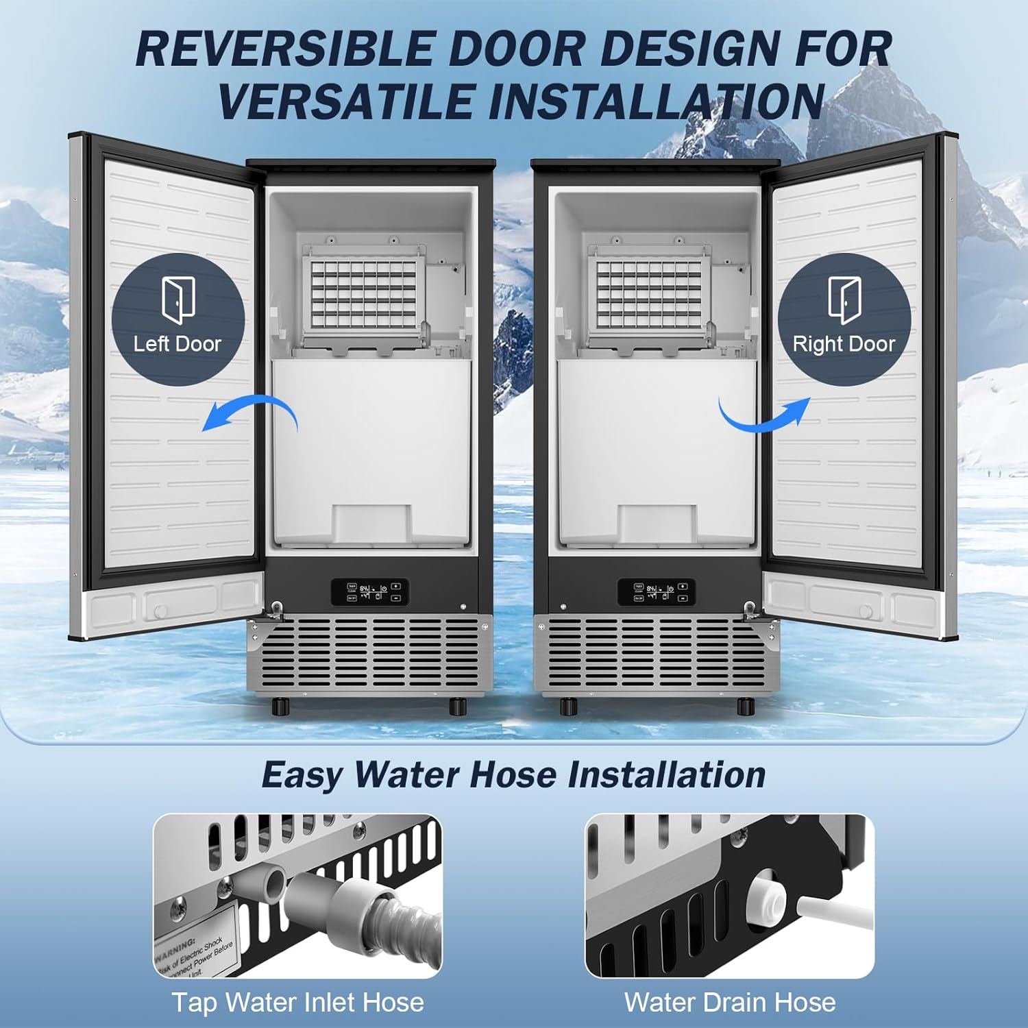 - 【Flexible Built-In or Freestanding Design】Whether built under the counter or used as a freestanding unit, this ice maker fits seamlessly into any space. Features include a reversible door for left/right opening, and adjustable leveling feet, offering maximum placement flexibility for home or commercial environments.