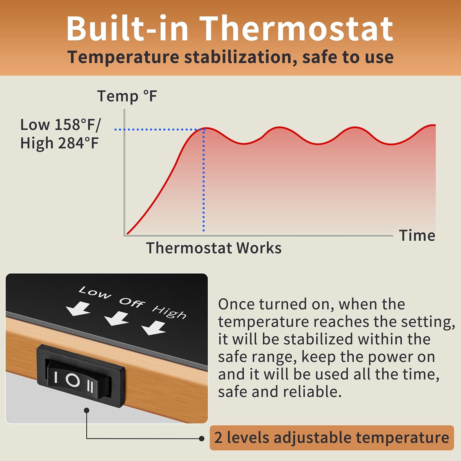 - Safe & Sustainable - 1.With 0.78“ anti-scald edge on the glass surface and aluminum edge, the electric warming mat effectively prevents accidental touching of scalding. 2.With 0.59” raised rubber feet, warming trays for buffets party are non-slip, have better heat dissipation, can be rest assured to placed on marble counters, wooden tables, glass tables and other tabletops for use. 3.The food warmer uses 78" extended power cord, easy to move, no need to worry about the use of space limitations.