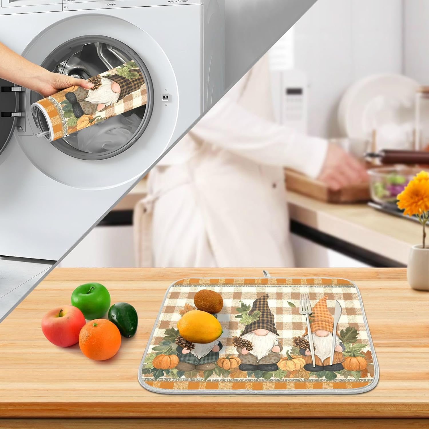 Fall Pumpkin Gnomes Maple Leaves Autumn2 Dish Drying Mat for Kitchen Counter Absorbent Microfiber Small Drying Pad Dish mats for Kitchen Countertops 16 x 18 Inch