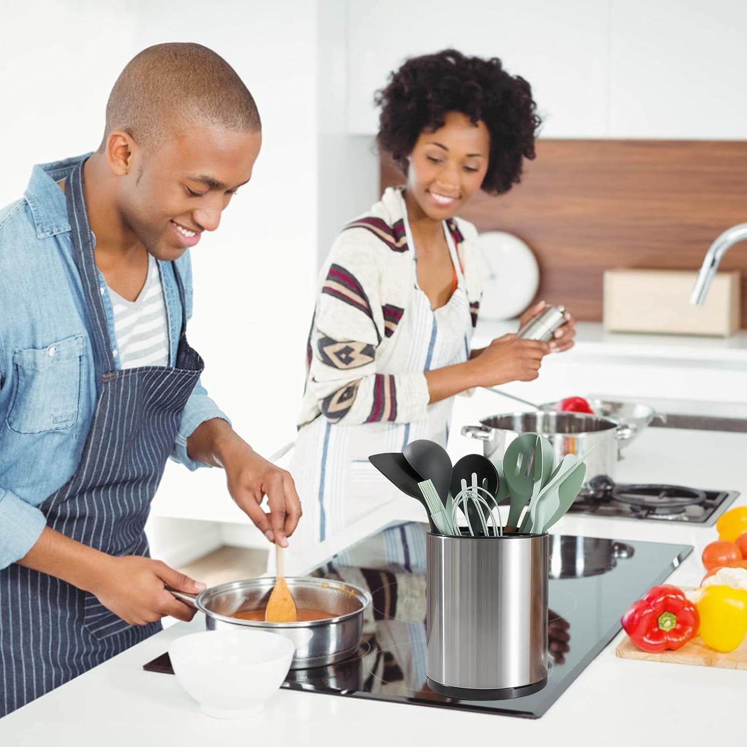 - 【Spacious Yet Compact Organizer】 Tame kitchen chaos with our 6.25"×6.25"×8" stainless steel utensil holder. Its space-saving design stores 15+ tools (spatulas, tongs, spoons) while keeping countertops clutter-free. Transform your kitchen into a minimalist haven where every tool has its place