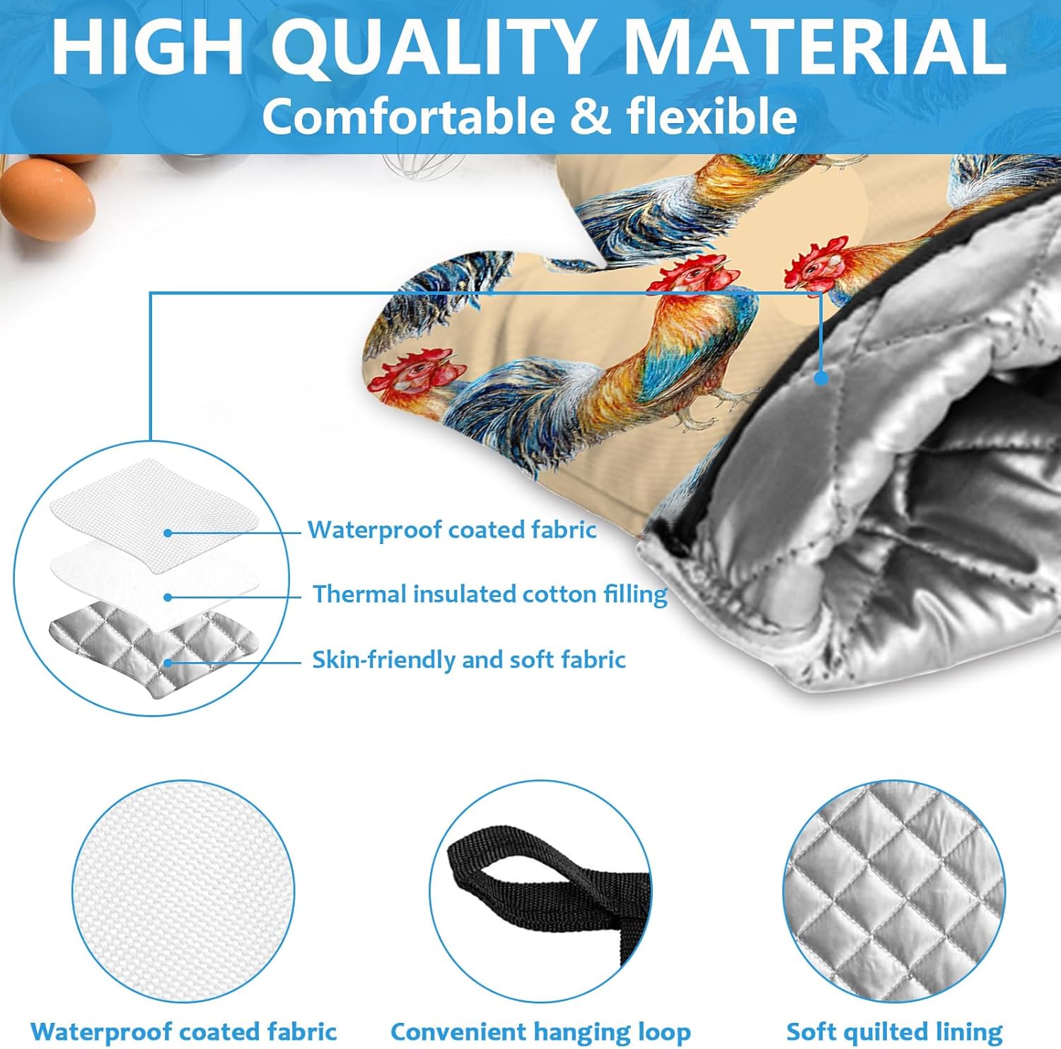 Watercolor Rooster Oven Mitts and Pot Holders Sets Heat Resistant 4Pcs Potholders Oven Gloves Hot Pads for Kitchen Baking Cooking Grilling BBQ