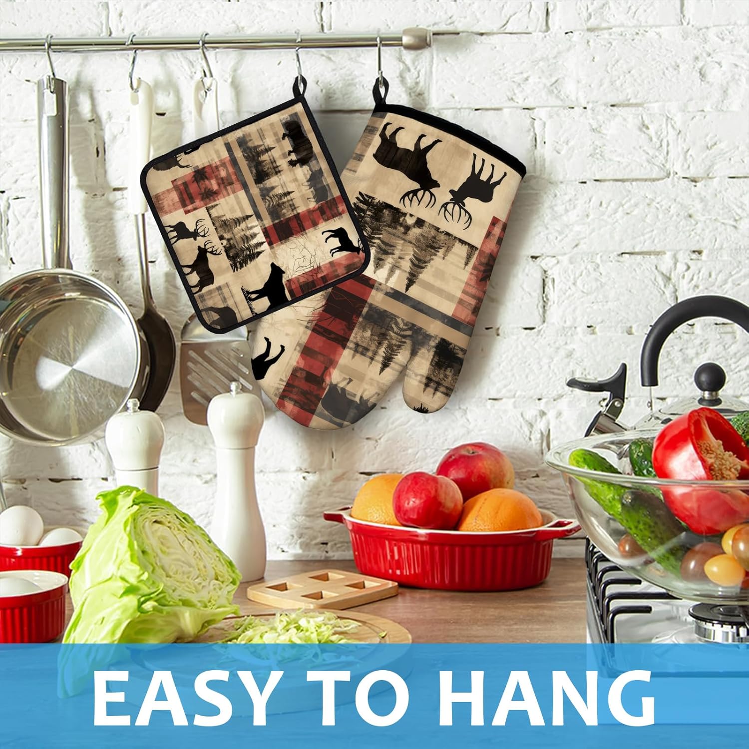 Deer and Bear Oven Mitts and Pot Holders Sets Heat Resistant 4Pcs Wild Animal Potholders Oven Gloves Hot Pads for Kitchen Baking Cooking Grilling BBQ