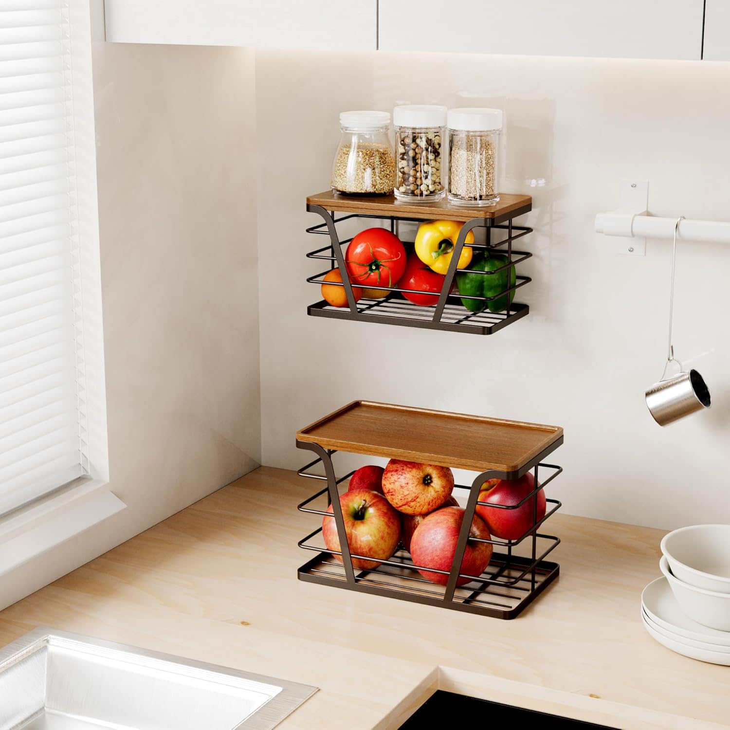 - Easy to use: Use as a kitchen counter organizer with non-slip pads (attach to bottom for stability). Wall-mount on smooth surfaces with adhesive hooks (no drilling needed); for drilled installation, opt for our extra-large size.
