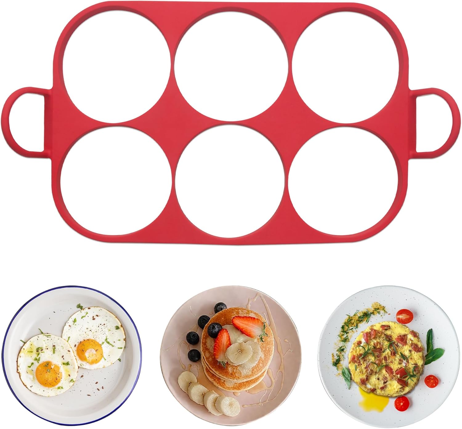 Baker's Friend 6 Round Silicone Egg Rings for Frying Eggs & Pancake, Non-Stick & Heat-Resistant, Ergonomic Handles, Omelette Ring for Griddle, 4 Inch, Red