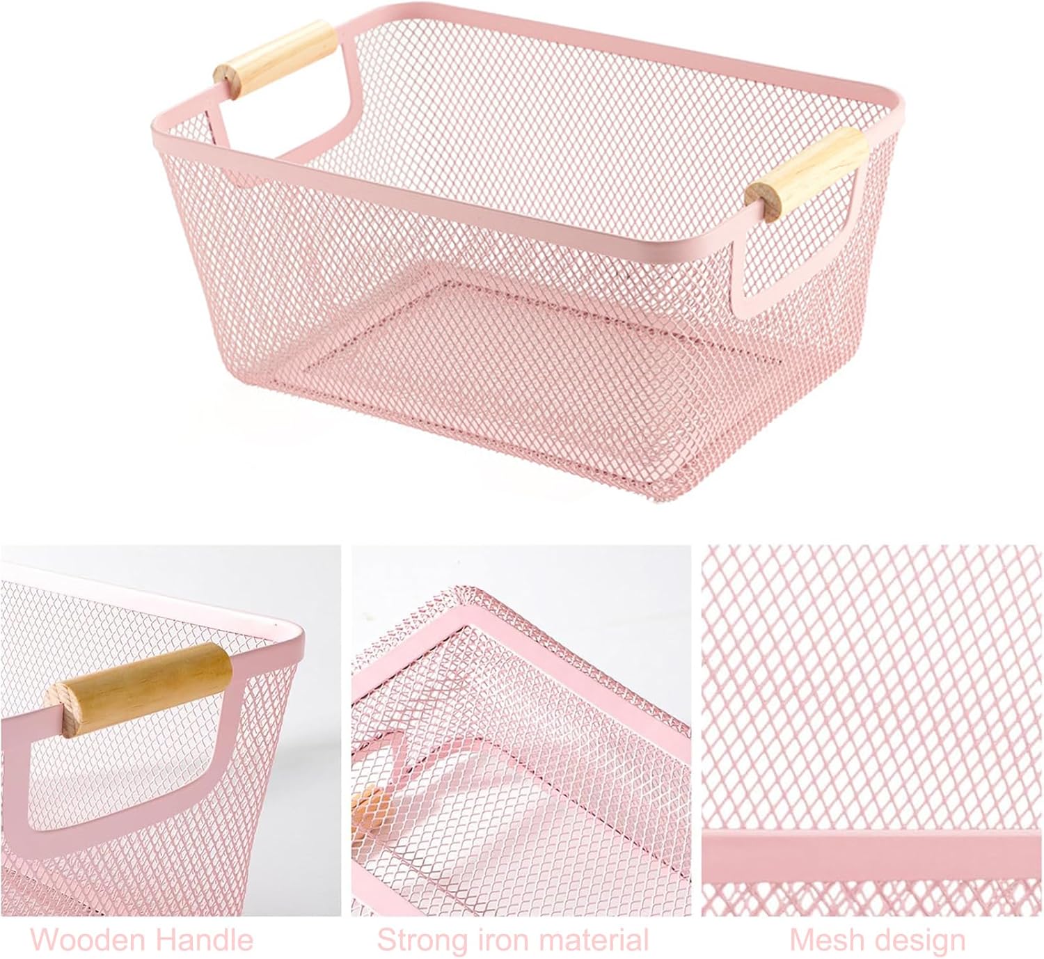 Metal Mesh Steel Basket, Medium Wire Storage Organizer Basket Multi-function Hanging Kitchen Basket with Wood Handle for Kitchen Bathroom Picnic Home, Rectangle-Pink