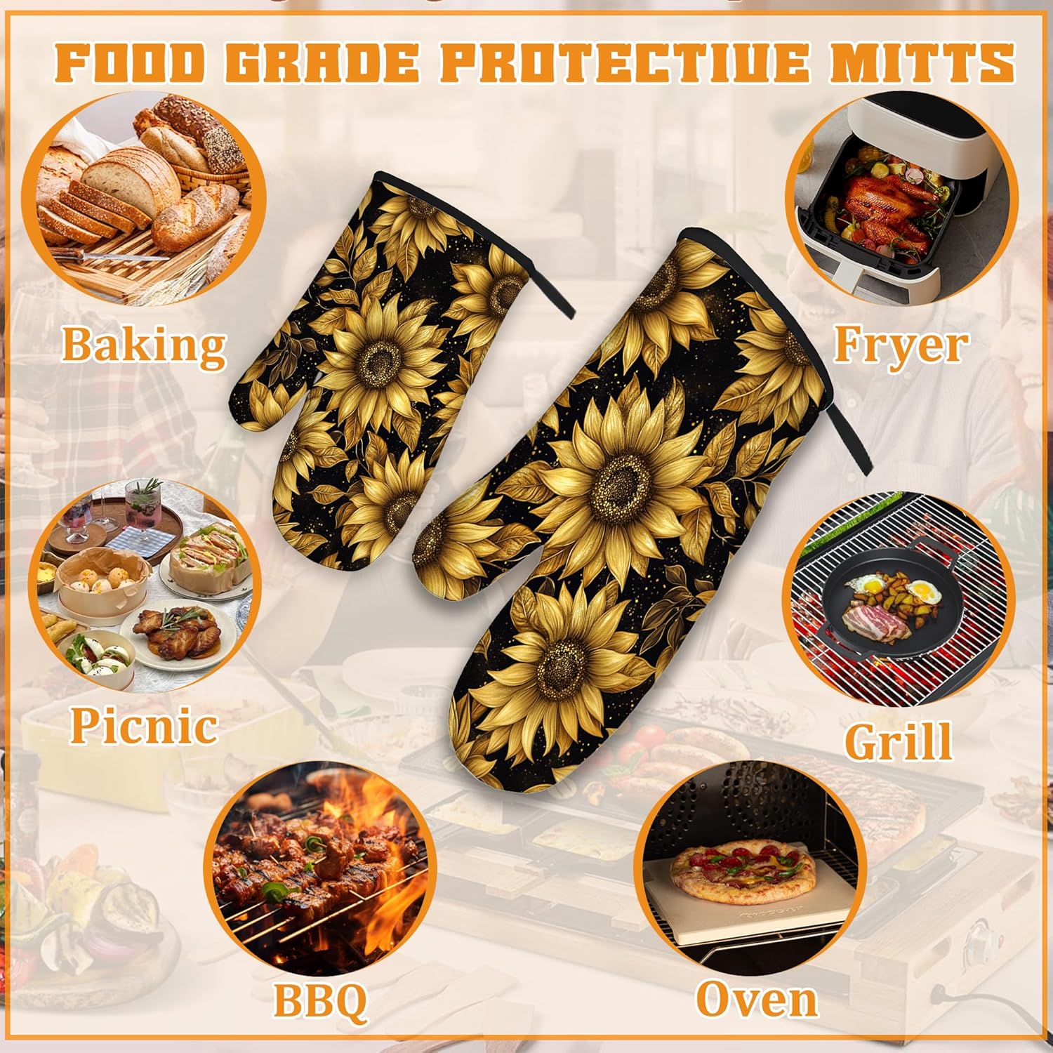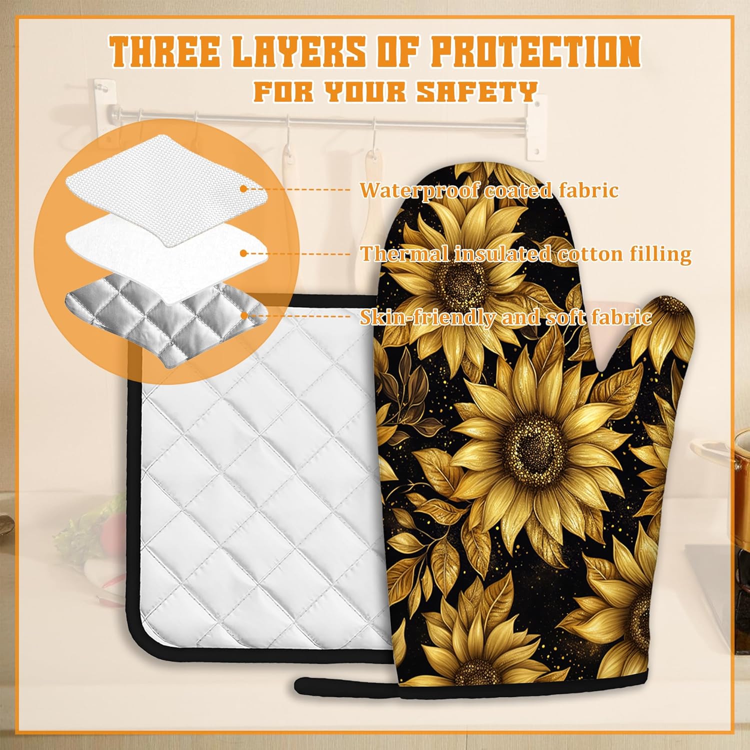 Vintage Sunflower Oven Mitts and Pot Holders,Sparkling Heat Resistant Oven Mitts Gloves and Pot Holder for Home Kitchen Decorations Cooking Baking BBQ Gifts,Set of 4