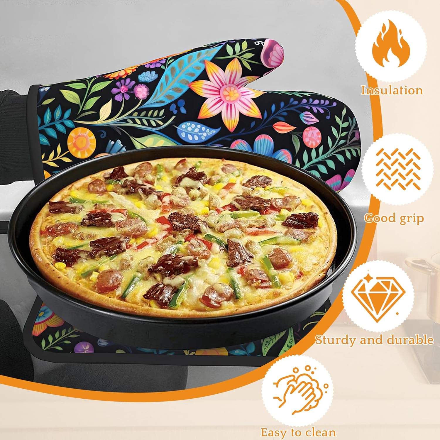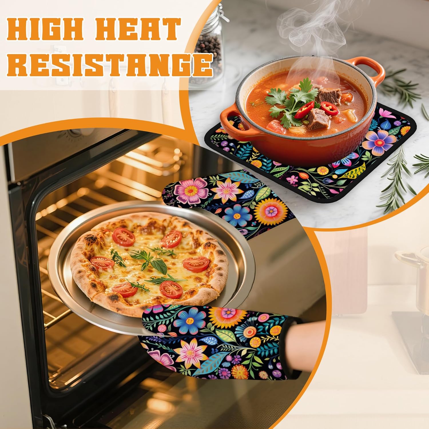Vintage Hippie Flower Oven Mitts and Pot Holders,Heat Resistant Oven Mitts Gloves and Pot Holder for Home Kitchen Decorations Cooking Baking BBQ Gifts,Set of 4