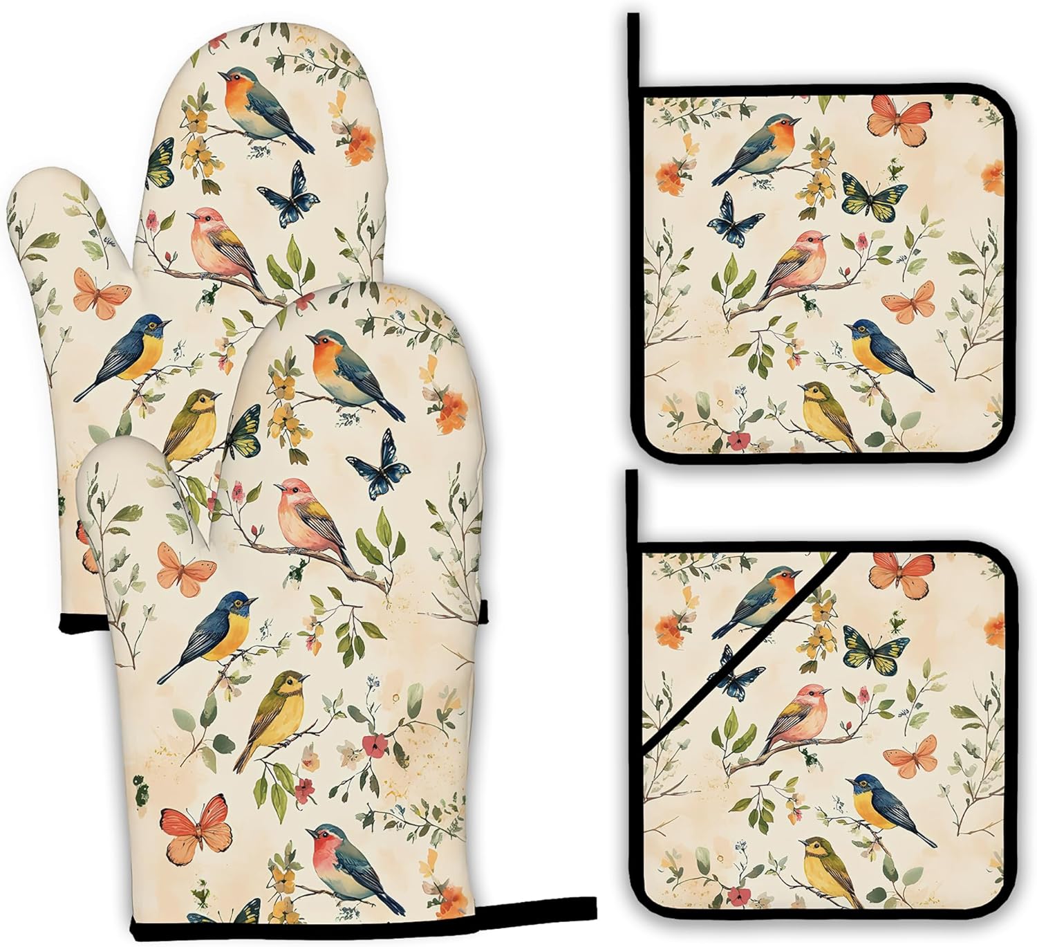 Vintage Butterfly Bird Oven Mitts and Pot Holders Set,Floral Flower Kitchen Oven Gloves and Pot Holder with Heat Resistant Non Slip for Cooking Baking Grilling(4 Piece Set)