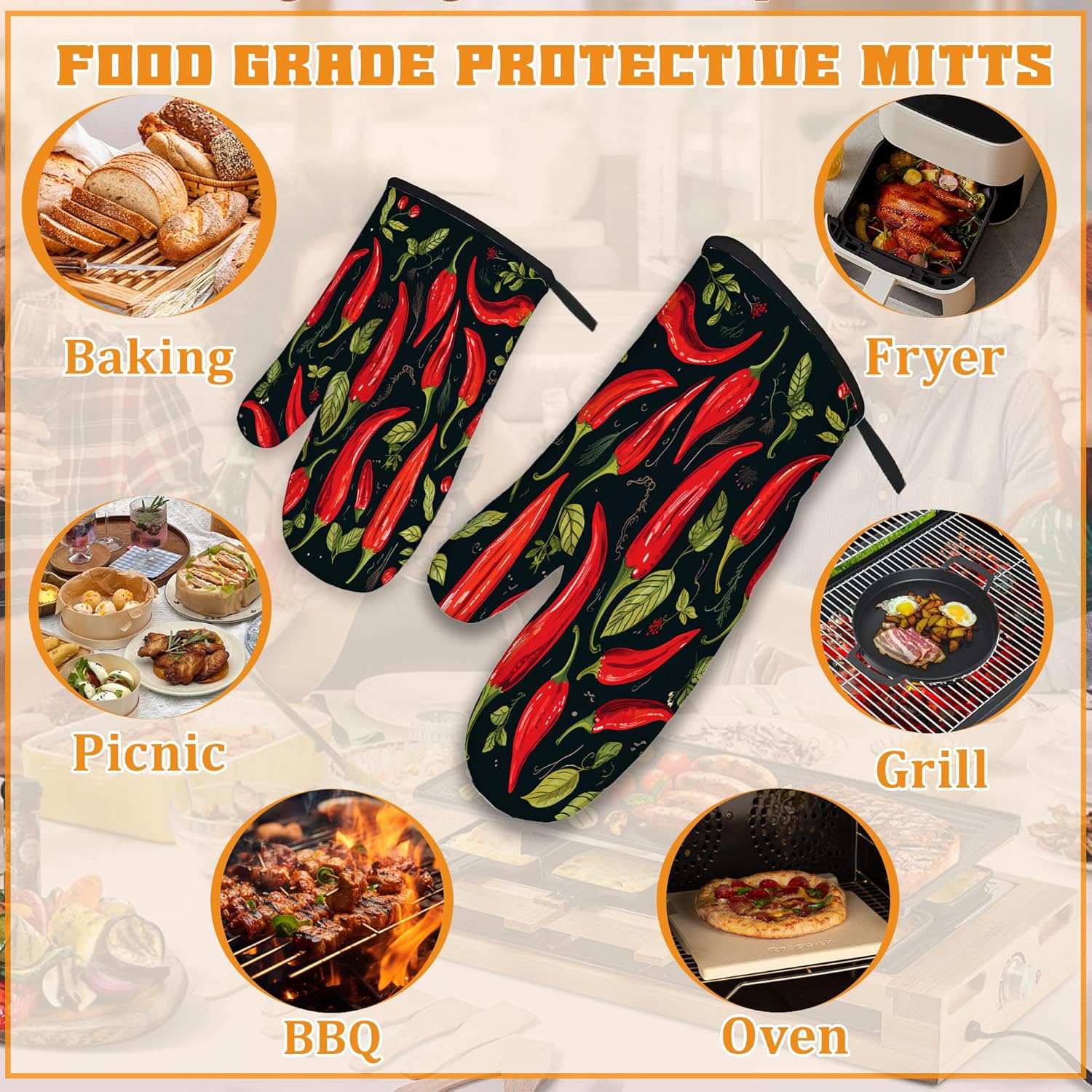 Red Pepper Oven Mitts and Pot Holders Set,Kitchen Oven Gloves and Pot Holder with Heat Resistant Non Slip for Cooking Baking Grilling(4 Piece Set)