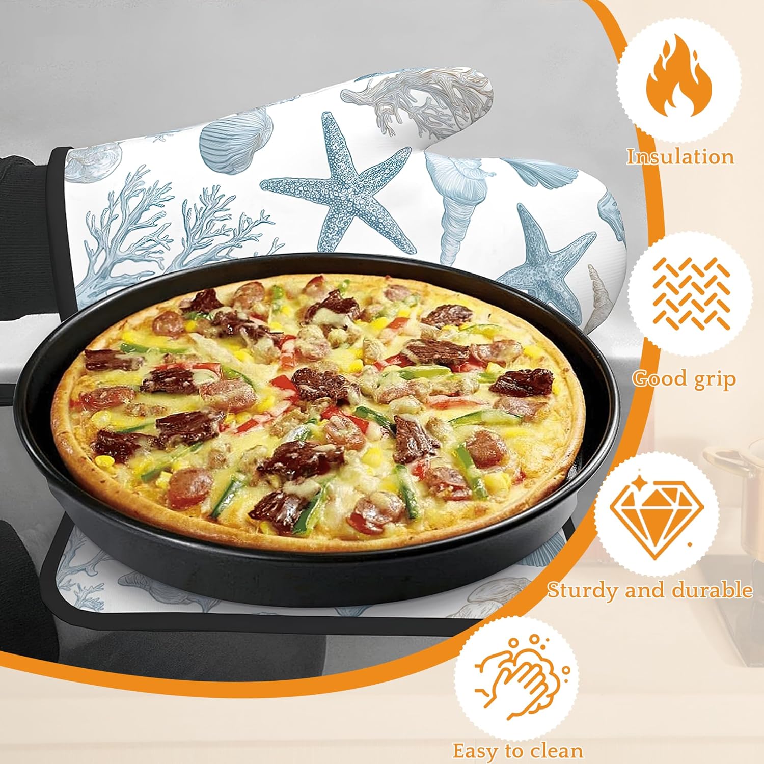 Starfish Oven Mitts and Pot Holders Set,Coral Shell Kitchen Oven Gloves and Pot Holder with Heat Resistant Non Slip for Cooking Baking Grilling(4 Piece Set)