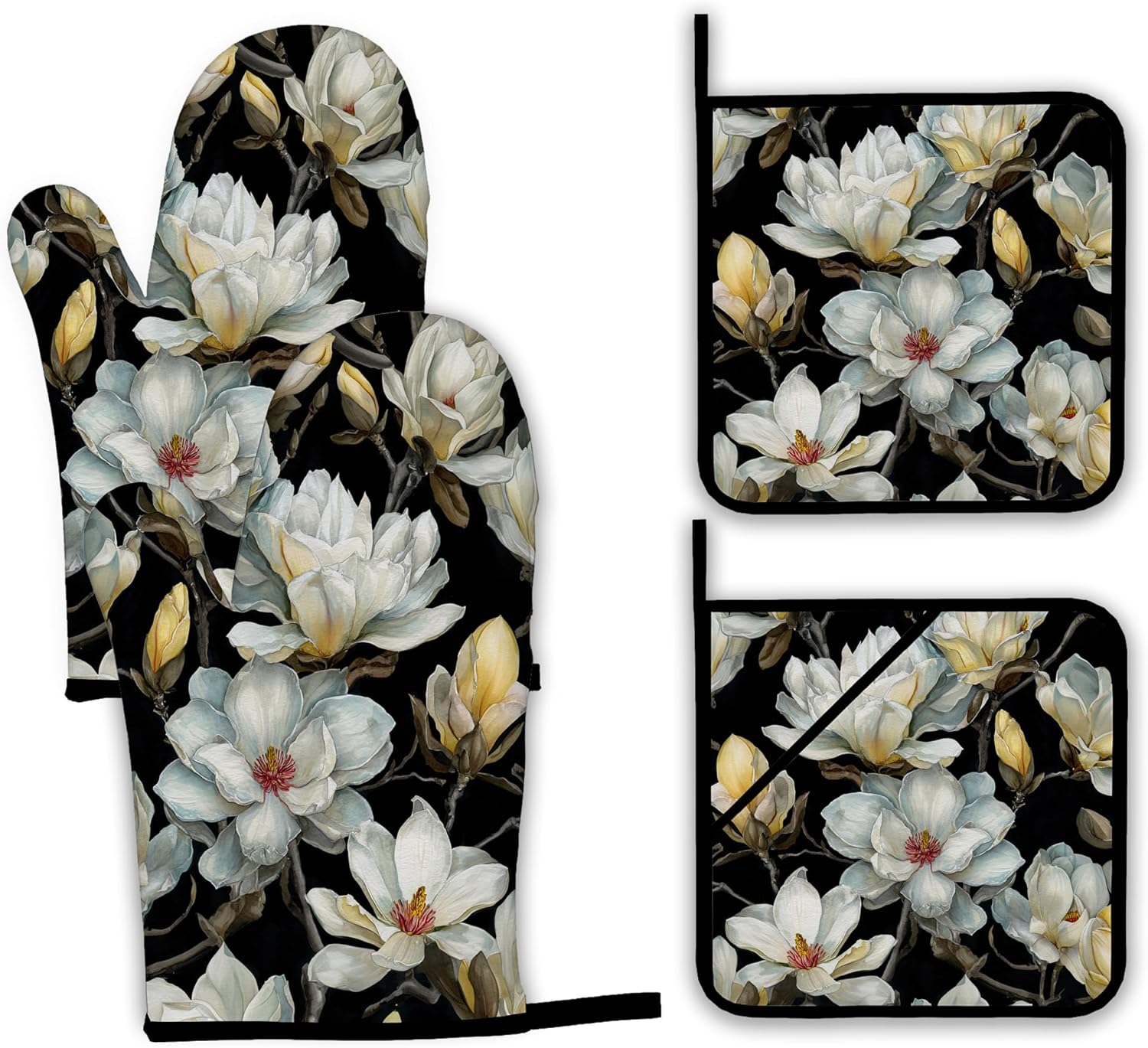 Vintage White Magnolia Oven Mitts and Pot Holders,Heat Resistant Oven Mitts Gloves and Pot Holder for Home Kitchen Decorations Cooking Baking BBQ Gifts,Set of 4