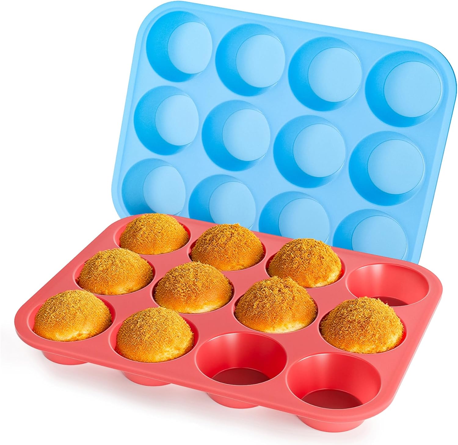 Bangp 12-Cup Silicone Muffin Pan with Metal Reinforced Frame,2 Pack Regular Size Cupcake Pan,Premium Non-Stick Bend Resistance Silicone Molds for Making Muffin,Cakes,Tart,Egg Bites (Red & Blue)