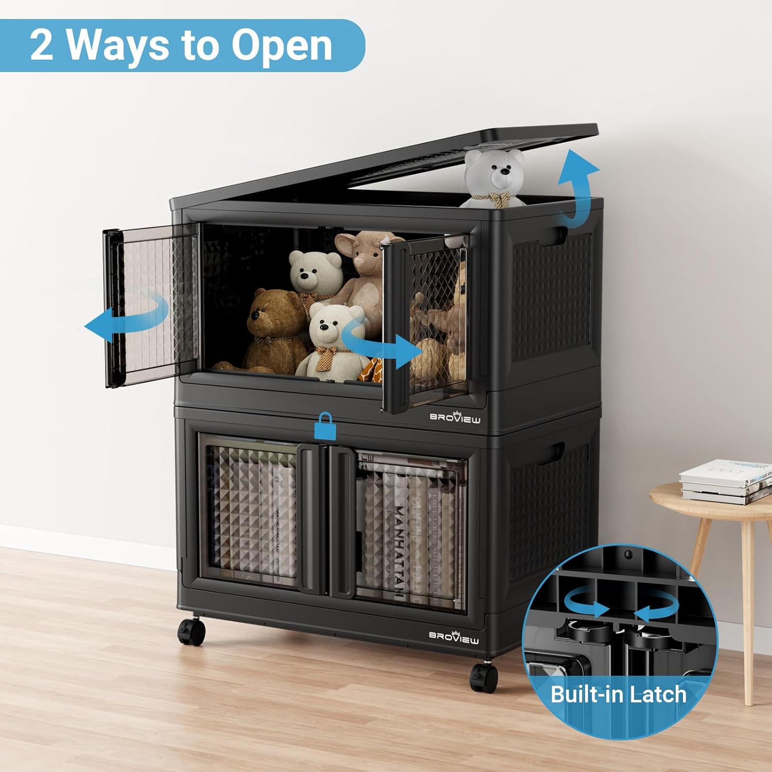 - 【Lockable Doors and 360° Rolling Wheels】The storage box offers two options: front-opening doors or top-opening doors. The door can be easily opened or locked by simply rotating 90°. The locking design effectively isolates pets such as dogs and cats from intrusion. The 4x 360-degree rotating wheels all have fixed functions and can be easily moved by releasing the valve, making them friendly to the elderly and young.