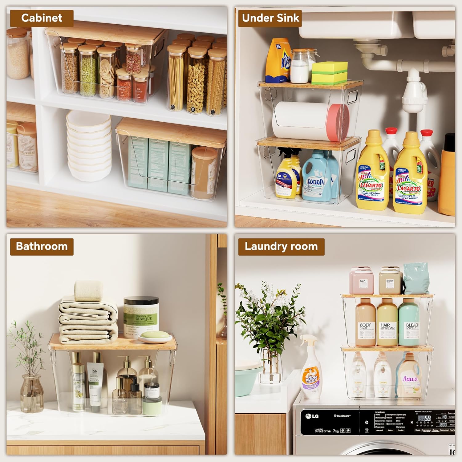 Criusia 2 Set Pantry Organizers and Storage with Bamboo Lids, Stackable Clear Bins for Onion, Potato, Fruit, Vegetables, Trash Bag Dispenser for Kitchen and Under Sink Organization