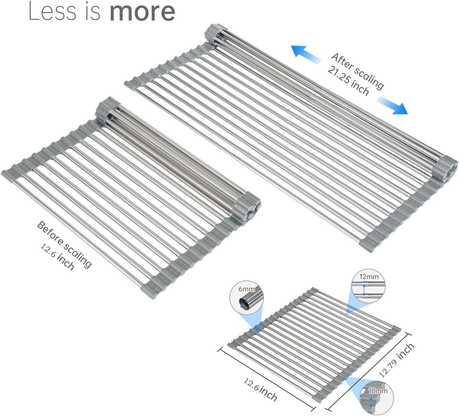 - 【Retractable Sink Drainer Roll Up】- LARGE Telescopic Drainer Rack Roll Up, The size of the roll up drain rack can be shrunk according to the required size at any time, so there is no need to worry about buying too large or too small sink roll up rack; Rolled Up Drying Rack 12.79 inches before expansion, 21.25 inches after expansion.Silicone can be cut according to needs, or the stainless steel tube can be disassembled and assembled at will.