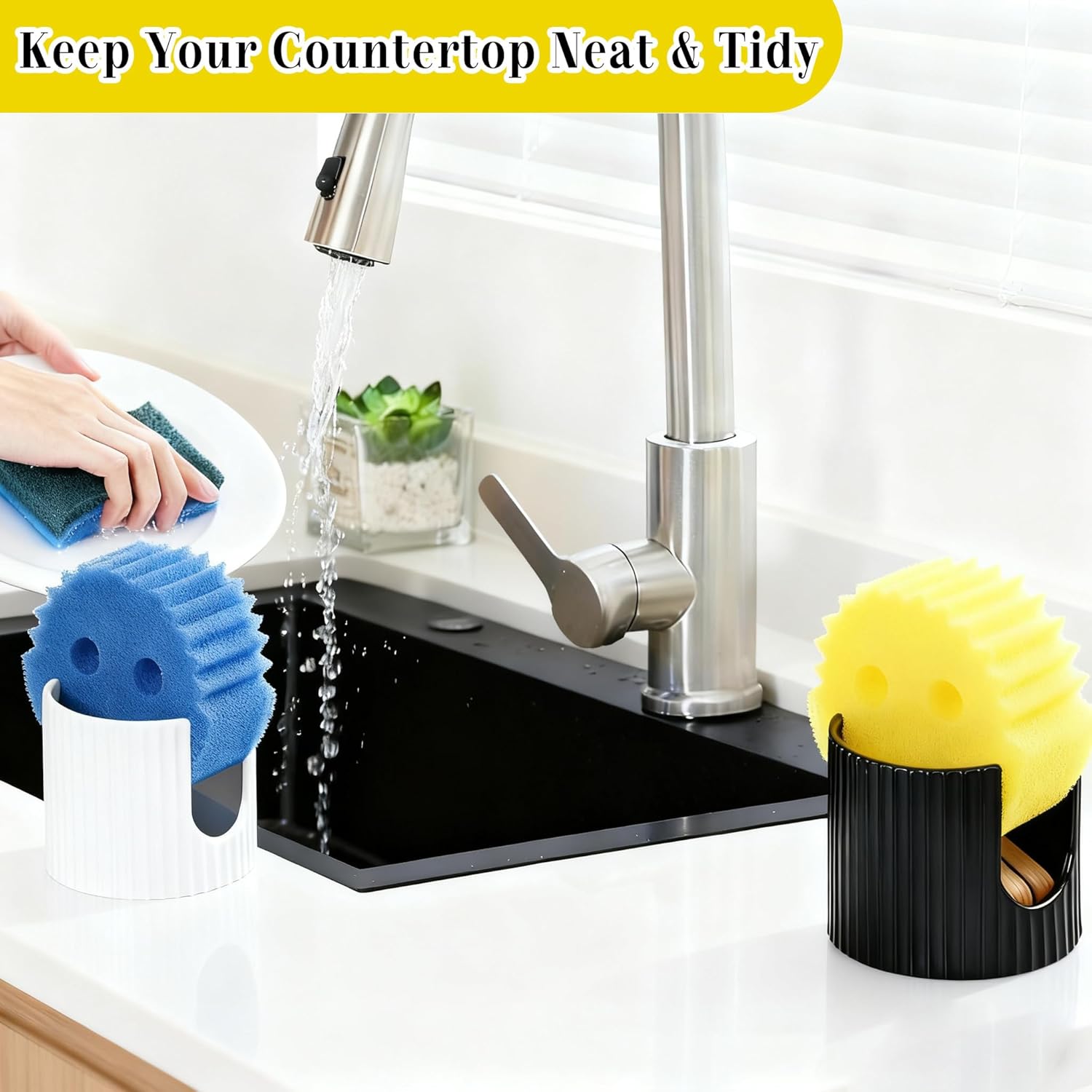 - Lead-Free & Hygienic Ceramic Material: Engineered for premium kitchen hygiene, this black sink sponge holder is 100% lead-free and features a non-porous ceramic surface. The non-porous design resists stubborn stains & unwanted odors—keeping your sponges fresh and your sink area safe for daily food prep.