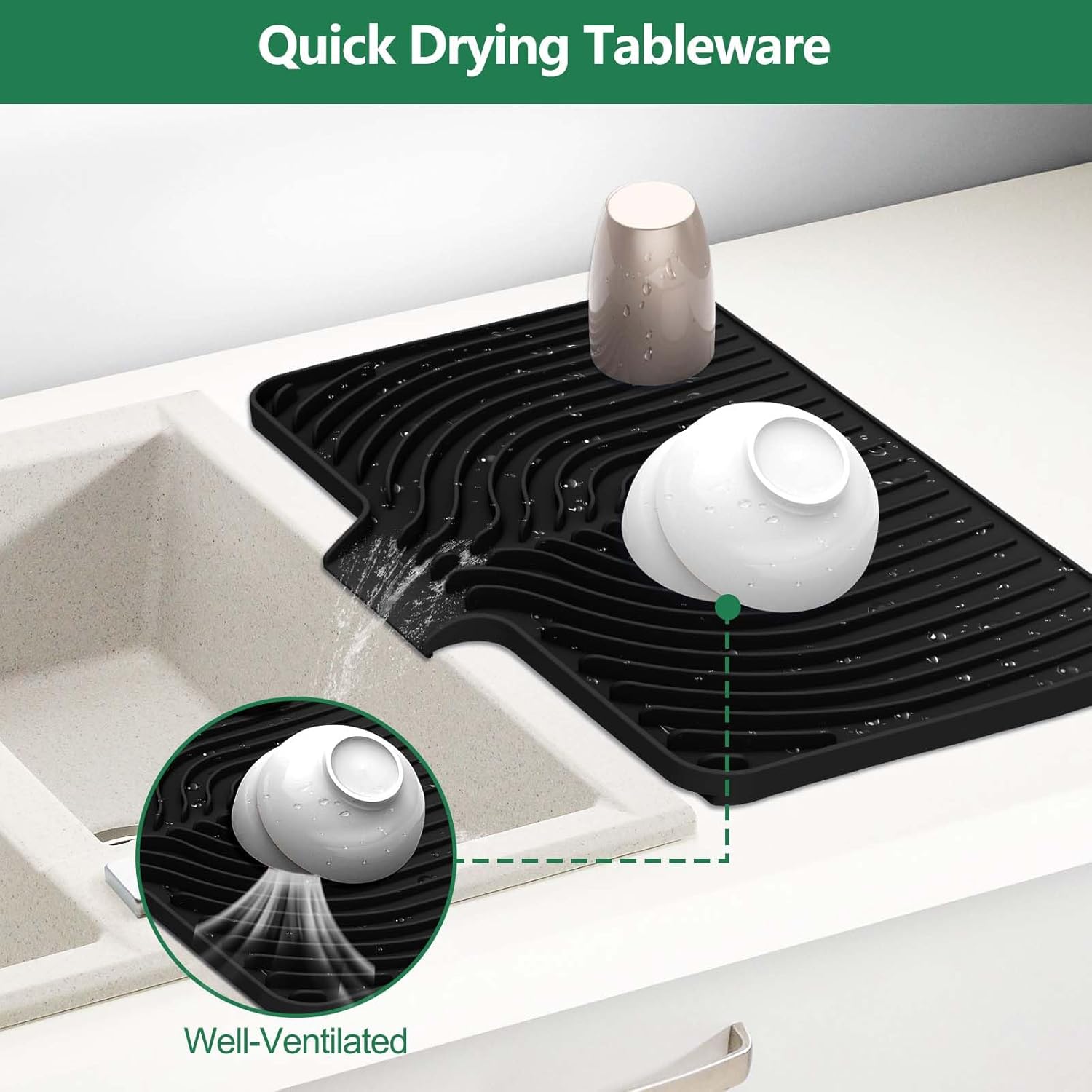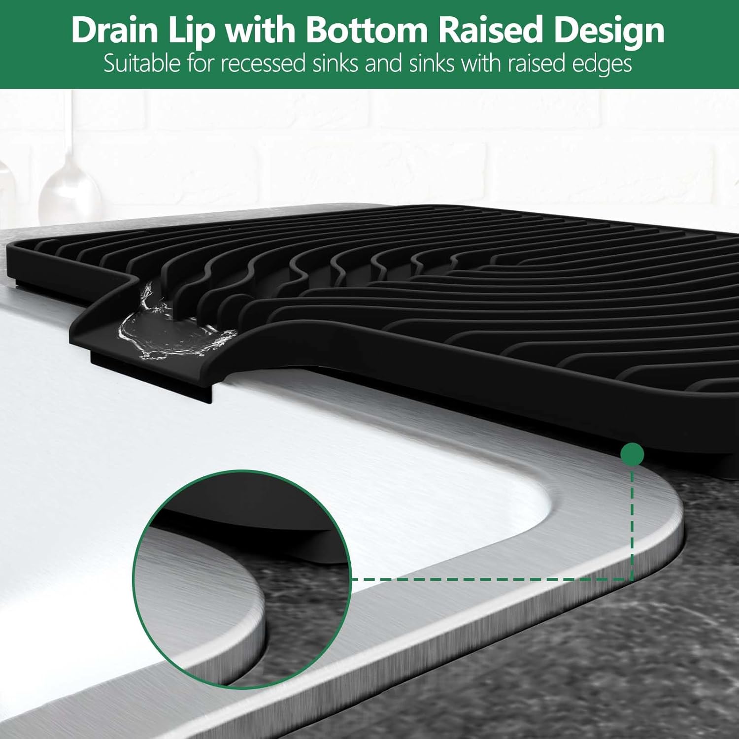 - Unique drain design: Drying matt kitchen counter work on both counter and sink. Its bottom's front is raised, fitting all sink designs like those with lips. Water gathers in the drain instead of flowing onto the counter, keeping it clean and tidy