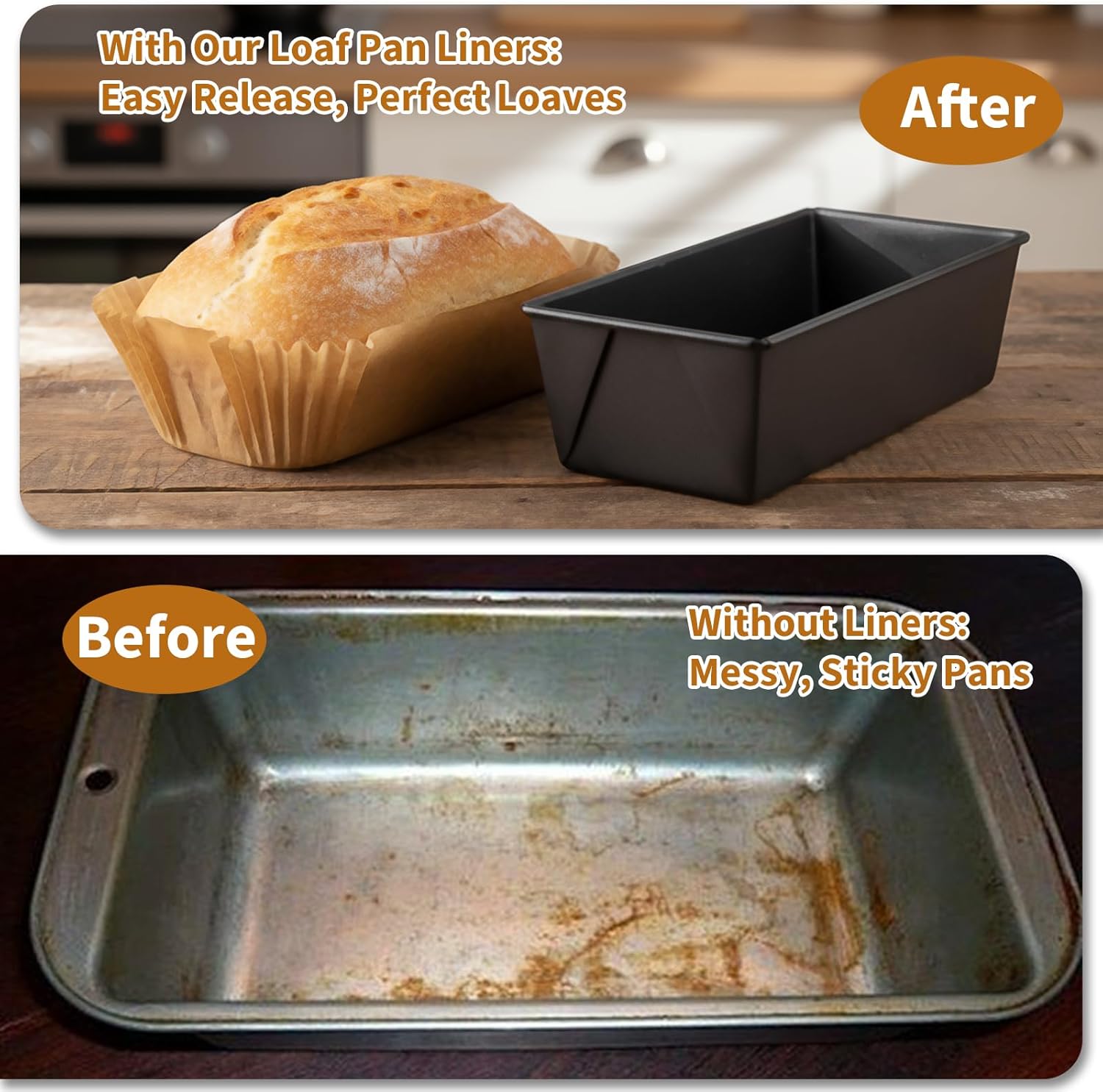 - Non-Stick Design β Our bread pan liners stop sticking and tearing, ensuring your baked goods slide out perfectly while keeping shape and texture intact