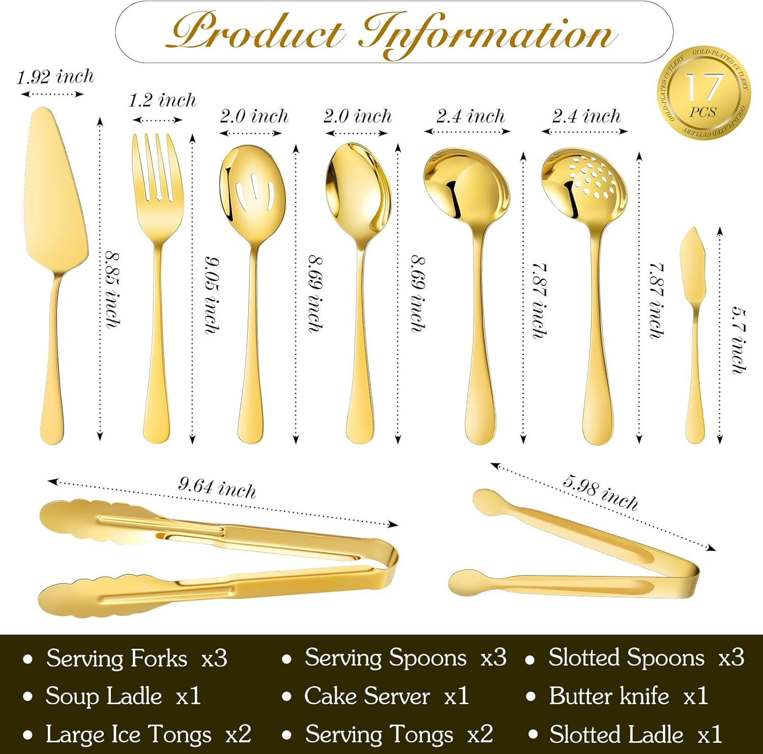 - 17-piece Gold serving utensil set: The package includes 2 large serving spoons, 2 slotted serving spoons, 2 serving forks, 2 serving tongs, 2 appetizer tongs, and 1 soup ladle and 1 pie server. These utensils are made of high-quality stainless steel and are durable, rust-proof, and easy to clean.