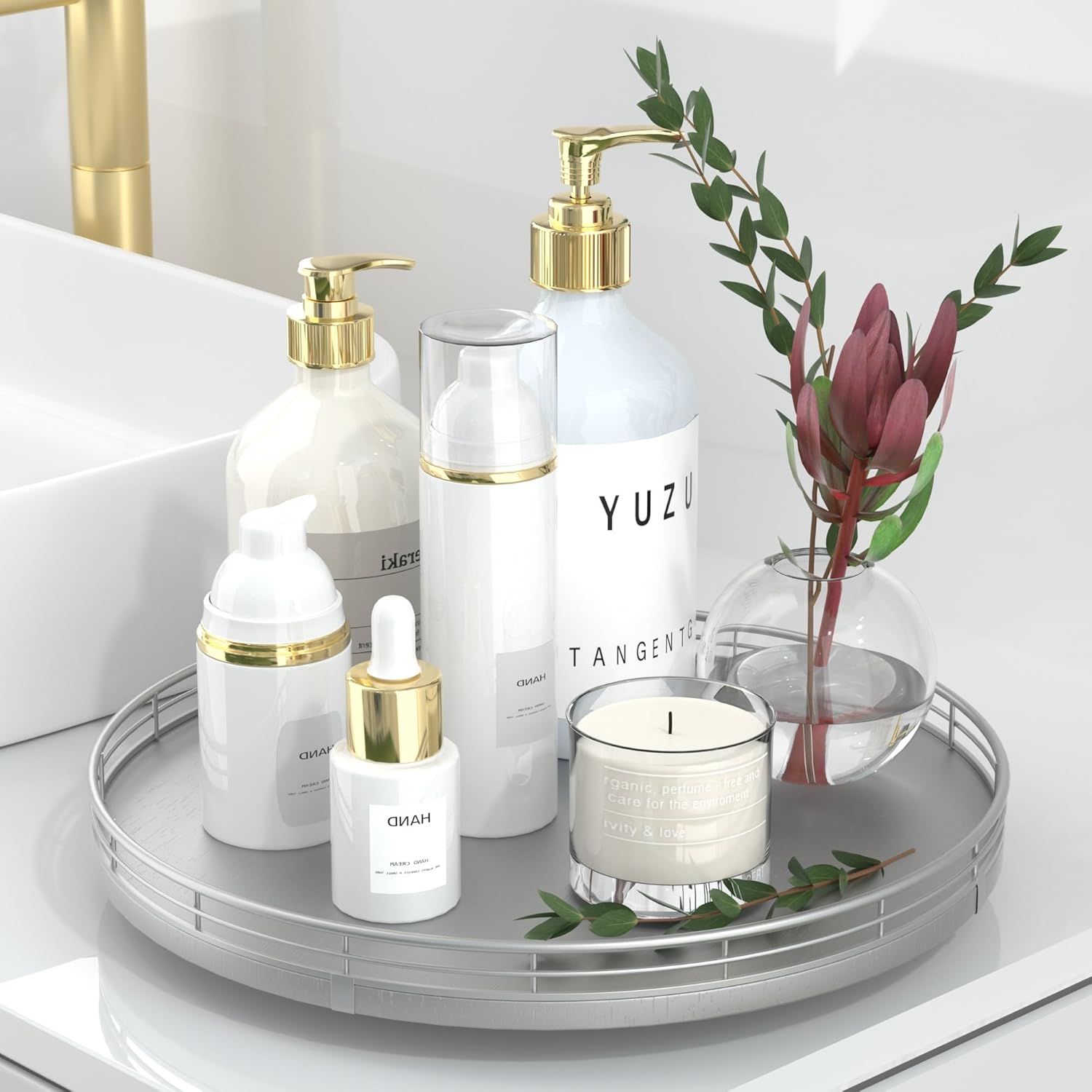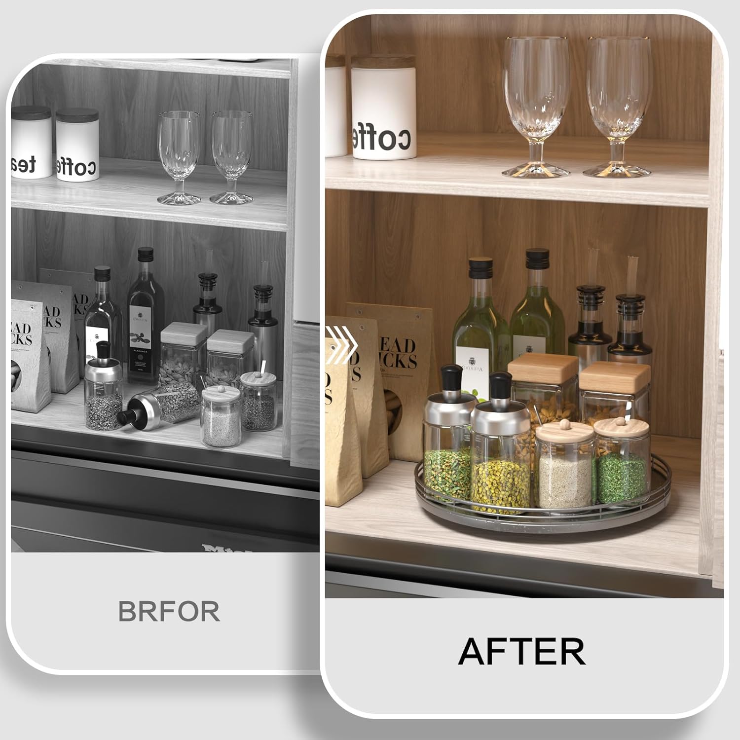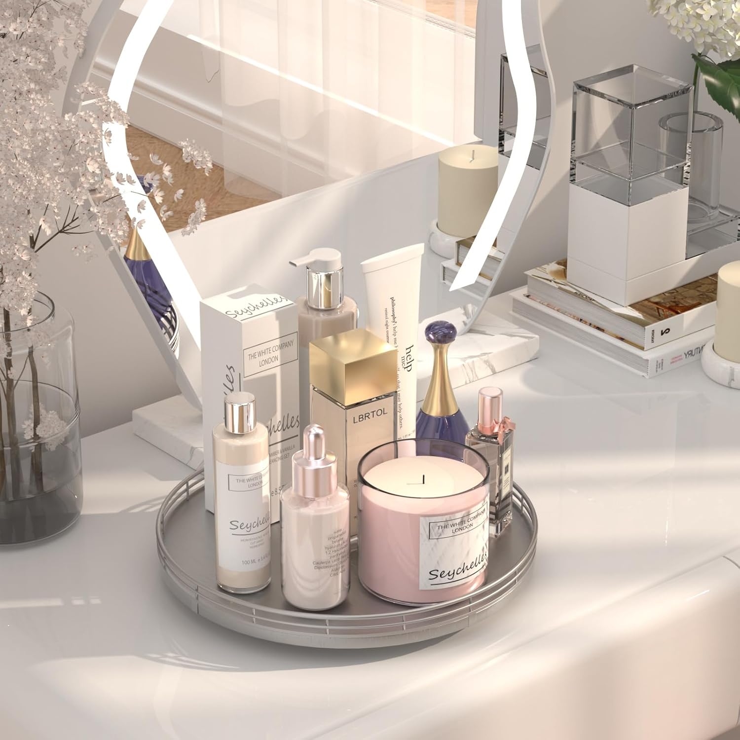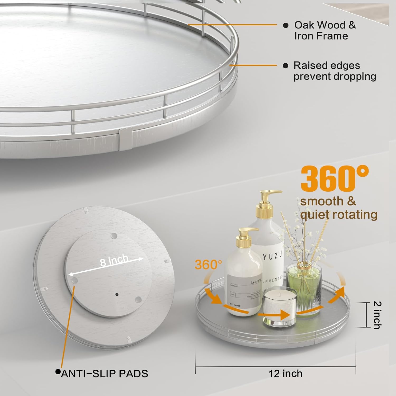- Thoughtful Design: The turntable silver tray features a smooth and silent 360°rotation; Bottom slip-resistant pads for stability and protect your countertop from scratches; Raised edges on each organizer tray to keep items from falling out; Easy to use, no installation required