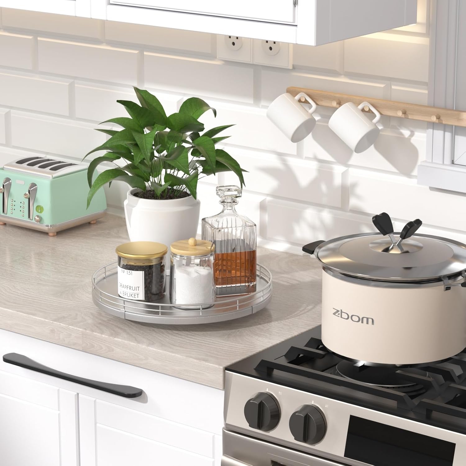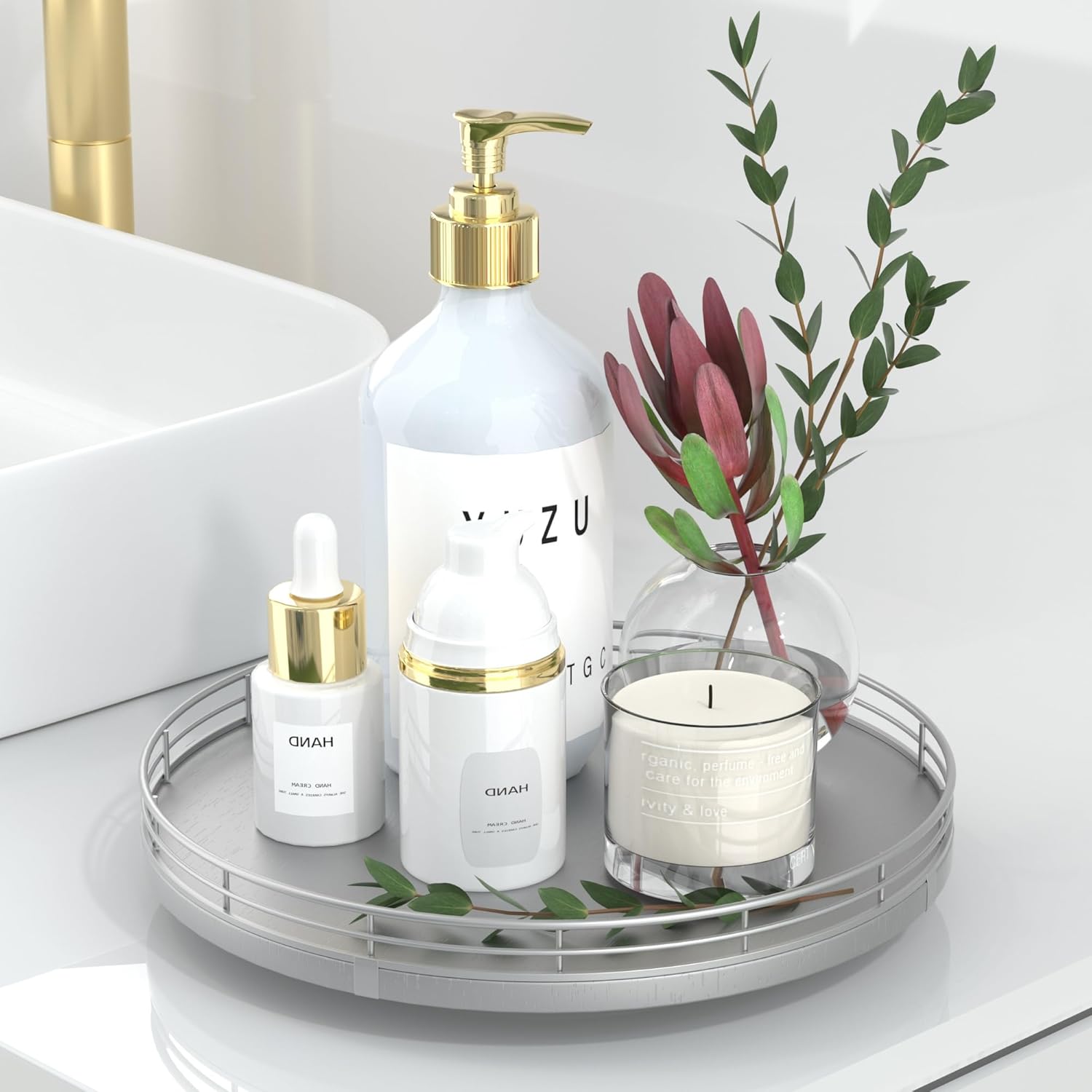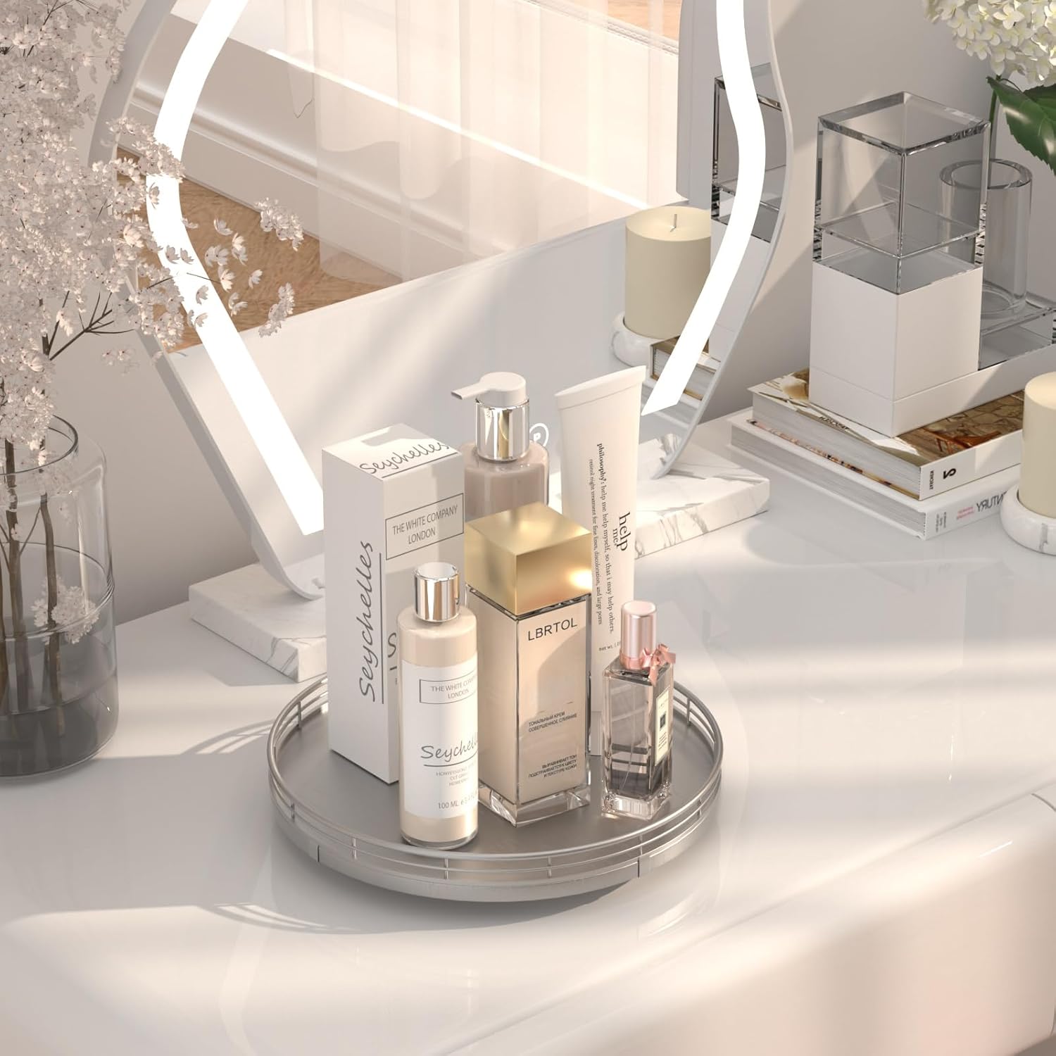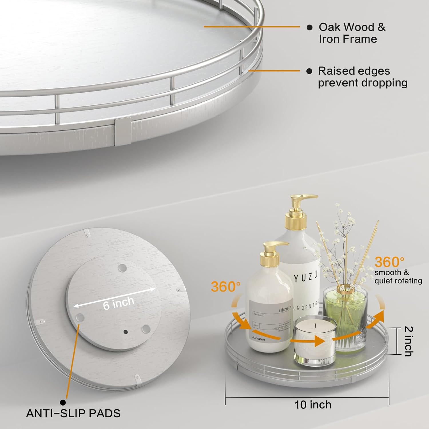 - Thoughtful Design: The turntable silver tray features a smooth and silent 360°rotation; Bottom slip-resistant pads for stability and protect your countertop from scratches; Raised edges on each organizer tray to keep items from falling out; Easy to use, no installation required