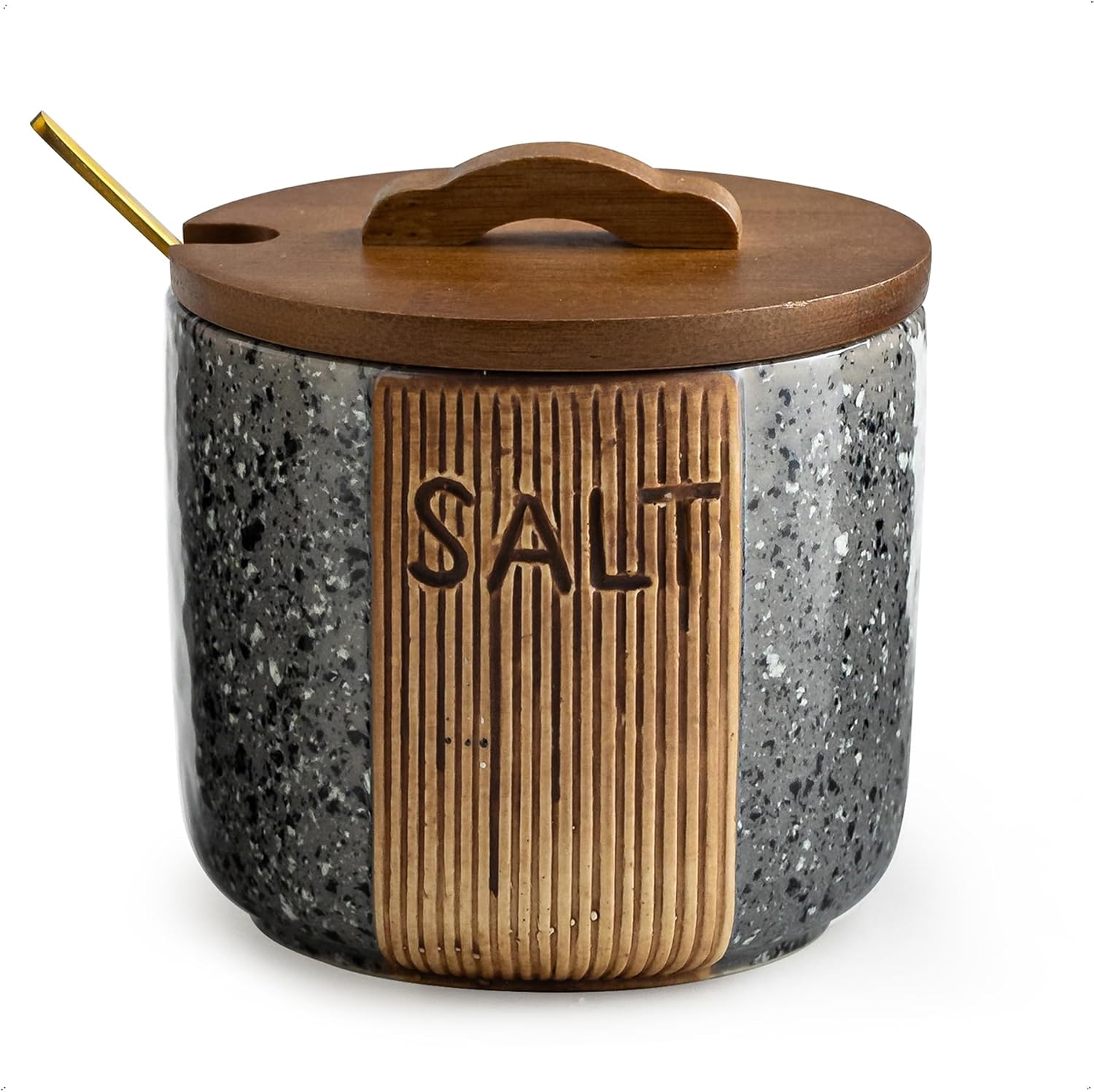 - Enhance your kitchen with this stylish salt container made of high-quality ceramic, featuring a woodgrain embossed design that mimics the look of wood. This salt containers for countertop combines rustic charm with sturdy ceramic, making it a perfect addition to your countertop