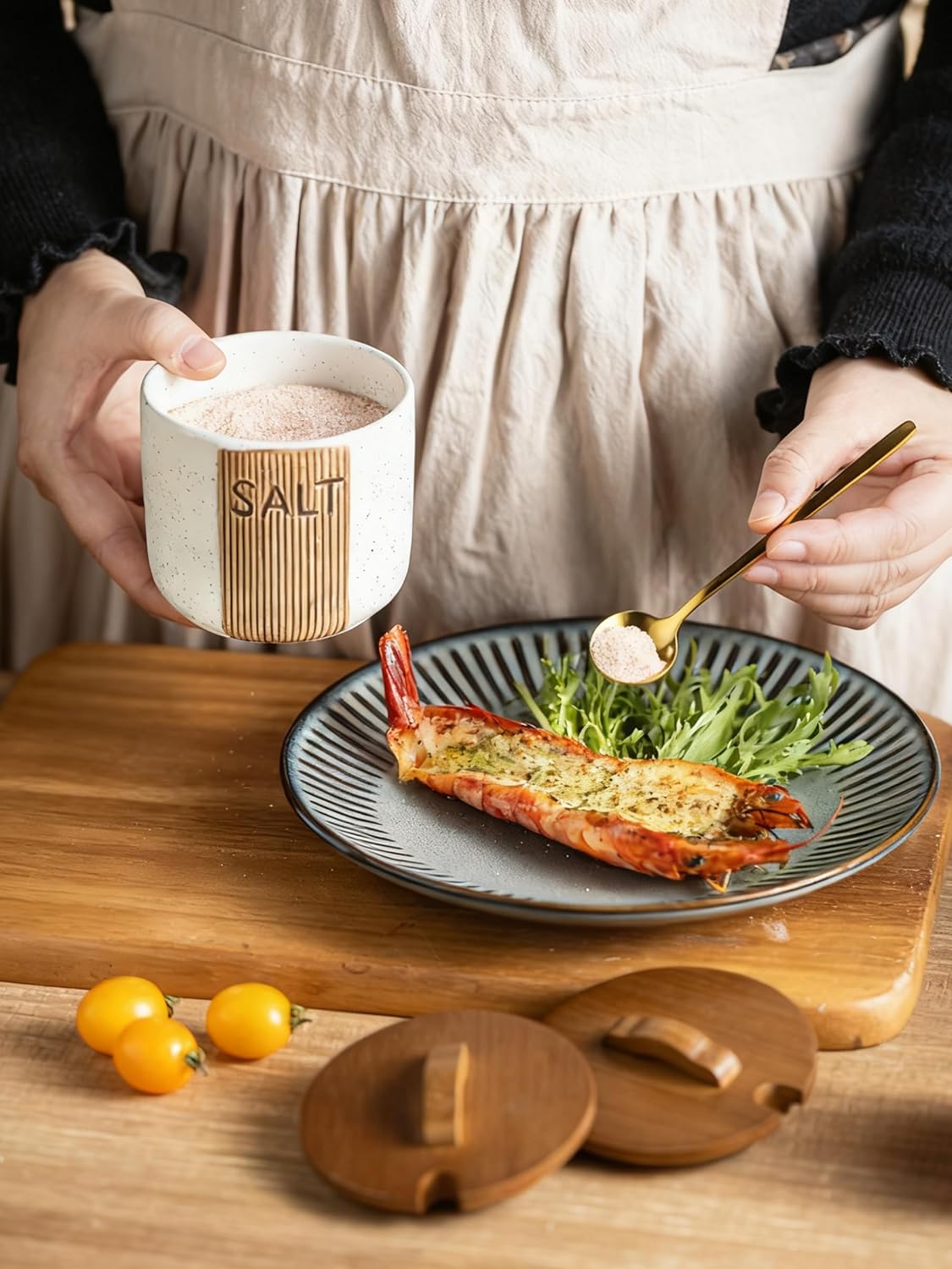 - This salt holder set includes a sleek wooden lid to keep your seasonings fresh and dry, along with a metal spoons for easy and precise dispensing. A perfect combination of style and functionality for your kitchen