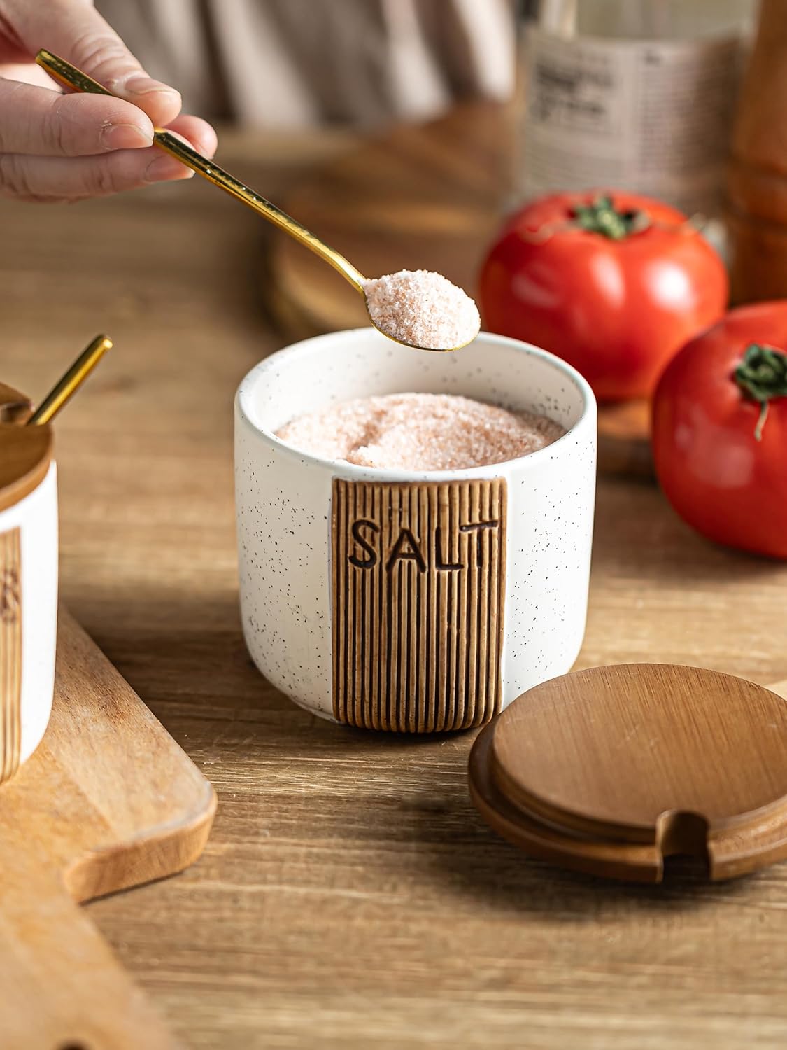 - Effortlessly access your seasonings with the smooth wooden lid of this salt cellar. Perfect for busy cooks, this salt container for countertop allows for quick, easy seasoning while preparing meals